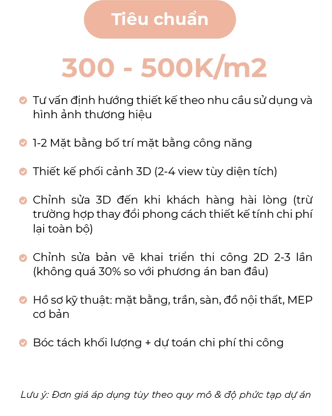 95% dự án chỉ chỉnh sửa tối đa 1-2 lần nhờ quy trình lấy brief rõ ràng ngay từ đầu. Nếu có thay đổi, đội ngũ luôn hỗ trợ cập nhật bản vẽ miễn phí trong phạm vi hợp đồng.